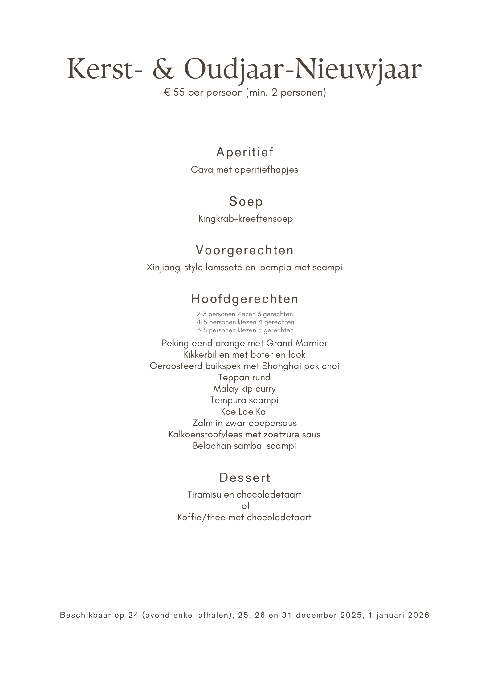 We wensen u een prettige kertfeest en een gelukkige nieuwjaar. Dit jaar hebben we een speciale menu
